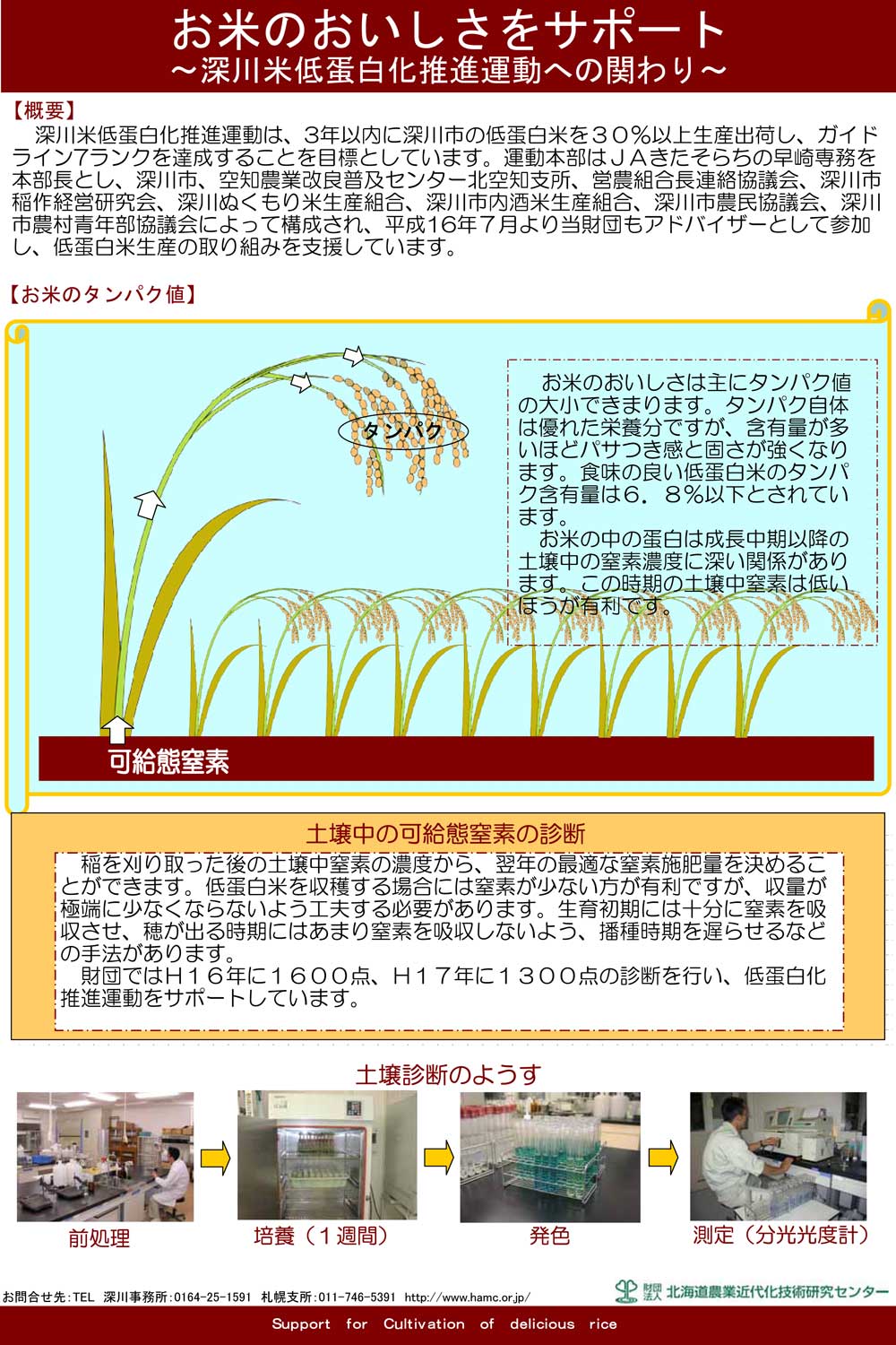 深川米低蛋白化推進運動は、3年以内に深川市の低蛋白米を30%以上生産出荷し、ガイドライン7ランクを達成することを目標としています。運動本部はJAきたそらちの早崎専務を本部長とし、深川市、空知農業改良普及センター北空知支所、営農組合長連絡協議会、深川市稲作経営研究会、深川ぬくもり米生産組合、深川市内酒米生産組合、深川市農民協議会、深川市農村青年部協議会によって構成され、平成16年7月より当財団もアドバイザーとして参加し、低蛋白米生産の取り組みを支援しています。