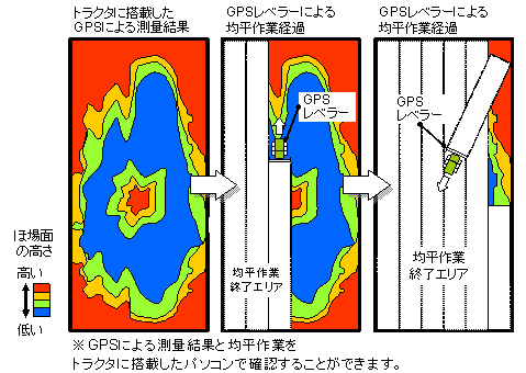 ほ場面の測量、標高マップ、整地標高マップ作成、レベラー制御、整地状況マップの表示によるオペレータ作業の支援が可能です。