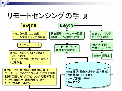 今回の事例は、産業用無人ヘリコプタにサーモトレーサを搭載し、ほ場単位で撮影した画像データから表面の水分状態を推定するもので、同一ほ場内、隣接するほ場間の水分状態を把握するのに有効な手法である。