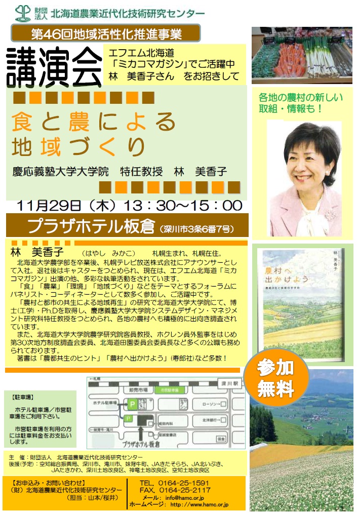 ~エフエム北海道「ミカコマガジン」でご活躍中 林 美香子さんを講師にお迎えし、「食と農による地域づくり」をテーマに講演会を行うことと致しました。 林 様は、慶応大学大学院教授として農村と都市との共生をテーマとした調査、ご研究をされるとともに、食・農業・環境を活かした地域づくり等でご活躍されており、今後の地域の活性化を推進する上で、有意義なご示唆をいただけるものと確信しております。