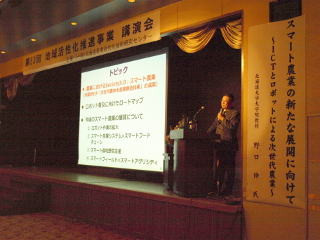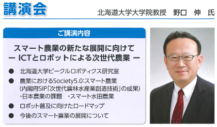 今回は、「スマート農業の新たな展開に向けてーICTとロボットによる次世代農業ー」としまして最先端技術を研究しておられる北海道大学大学院教授 野口 伸 氏にご講演を頂きました。