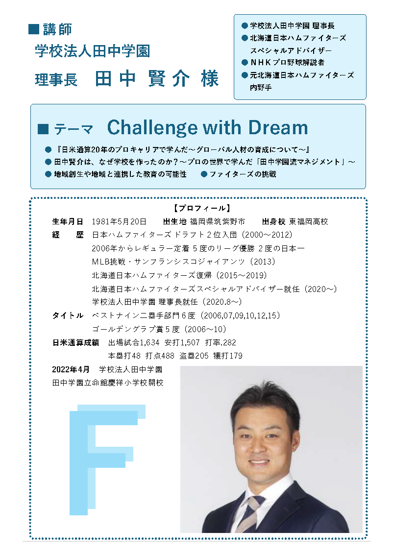 今回は「財団設立60周年記念講演」として、学校法人田中学園 理事長 田中賢介氏を講師に迎え「Challenge with Dream」と題し、ご講演をいただきました。