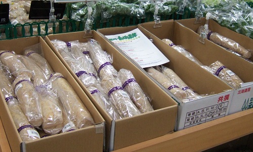 ごぼう、長ネギ、ニンジン、タマネギ、ジャガイモ、ほうれんそう、だいこん、完熟トマト、きゅうり、・・・等、多くの種類を販売いたしました。野菜は、いつも大人気です。