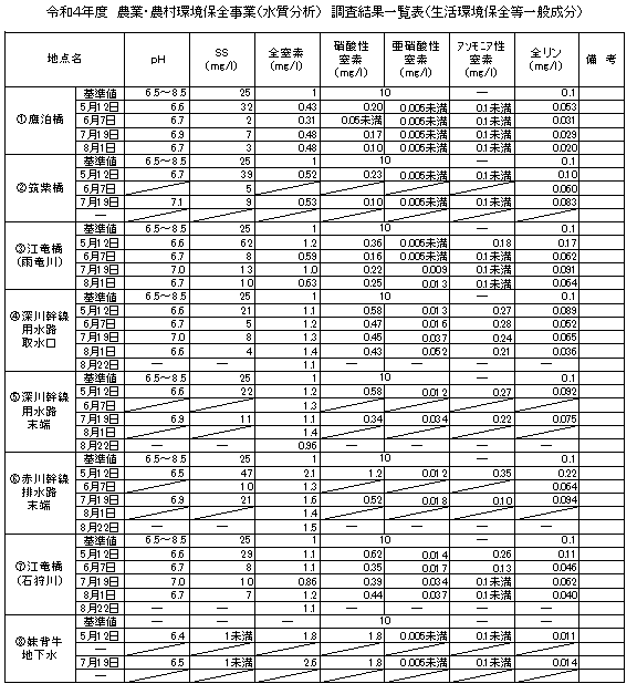 | 1) | 生活環境保全に係る環境基準項目、農業(水稲)用水水質基準項目、及び地下水の水質汚濁に係る環境基準項目等より水質分析7項目 |