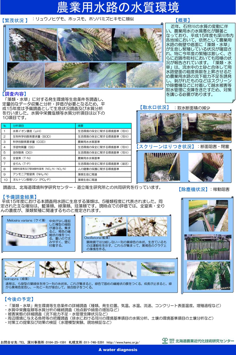 近年、石狩川の水質の変動に伴い、農業用水の水質悪化が顕著となっており、平成15年度も深川市内各地域において、依然として農業用水路の側壁や底面に「藻類・水草」が生息し繁殖している状況が確認され、特に今年度の繁殖は激しく、さらに近隣市町村においても同様の状況が報告されています。「藻類・水草」は、流水中の土砂と合体して用水路壁面の粗度係数を上昇させるため農業用水路の流下能力不足を誘発し、剥がれたものなどはスクリーンや除塵機などに付着して越水被害等取水管理に支障をきたすため、対策を講じる必要があります。