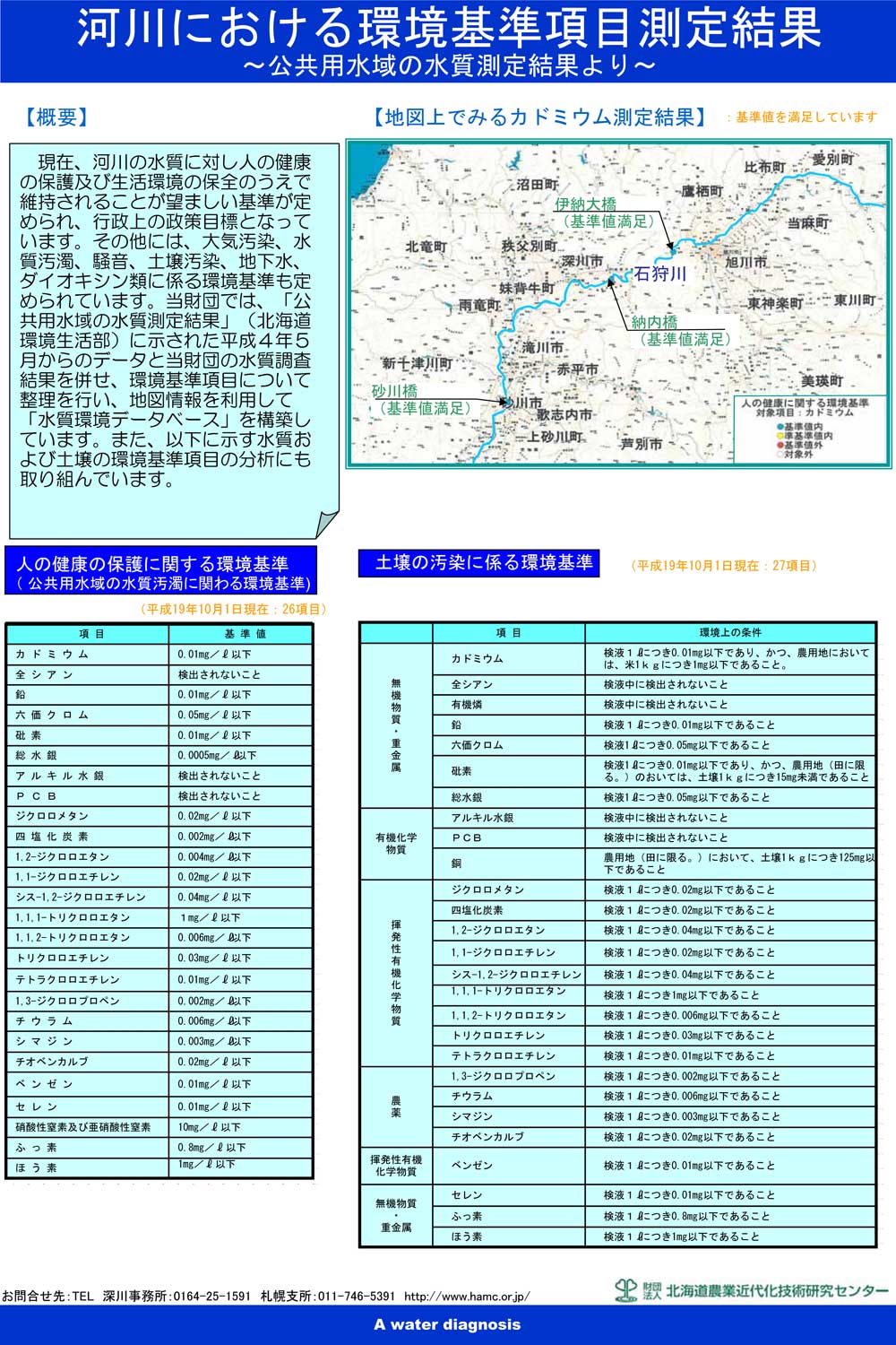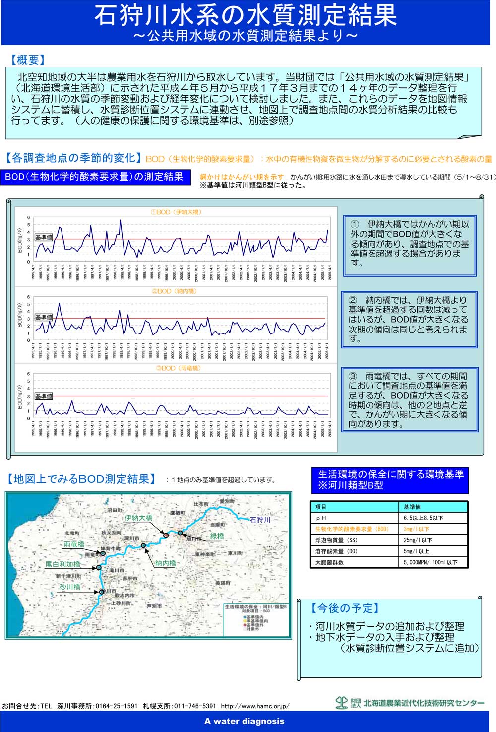 北空知地域の大半は農業用水を石狩川から取水しています。当財団では「公共用水域の水質測定結果」(北海道環境生活部)に示された平成4年5月から平成17年3月までの14ヶ年のデータ整理を行い、石狩川の水質の季節変動および経年変化について検討しました。また、これらのデータを地図情報システムに蓄積し、水質診断位置システムに連動させ、地図上で調査地点間の水質分析結果の比較も行ってます。(人の健康の保護に関する環境基準は、別途参照)