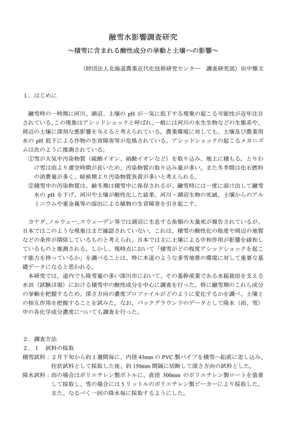 カナダ、ノルウェー、スウェーデン等では湖沼に生息する魚類の大量死が報告されているが、日本ではこのような現象はまだ確認されていない。これは、積雪の酸性化の程度や周辺の地質などの条件が関係しているものと考えられ、日本では主に土壌による中和作用が影響を緩和しているものと推測される。しかし、現時点において「積雪がどの程度アシッドショックを起こす能力を持っているか」を調べることは、特に本道のような多雪地帯の環境に対して重要な基礎データになると思われる。