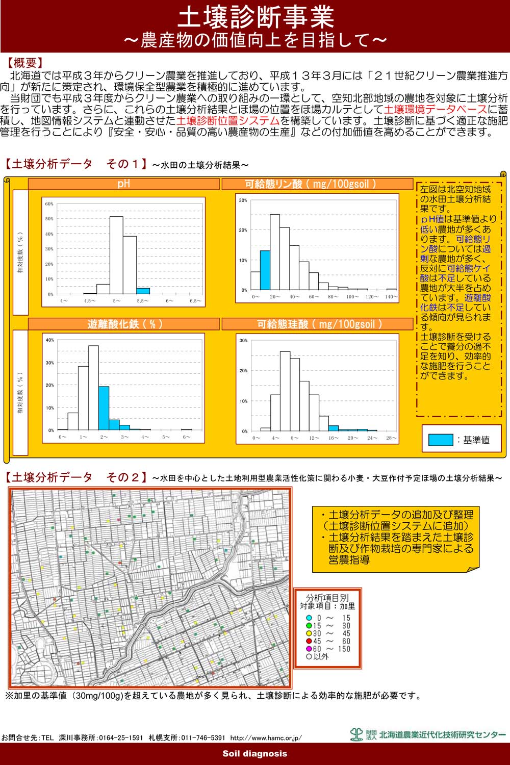当財団でも平成3年度からクリーン農業への取り組みの一環として、空知北部地域の農地を対象に土壌分析を行っています。さらに、これらの土壌分析結果とほ場の位置をほ場カルテとして土壌環境データベースに蓄積し、地図情報システムと連動させた土壌診断位置システムを構築しています。土壌診断に基づく適正な施肥管理を行うことにより『安全・安心・品質の高い農産物の生産』などの付加価値を高めることができます。