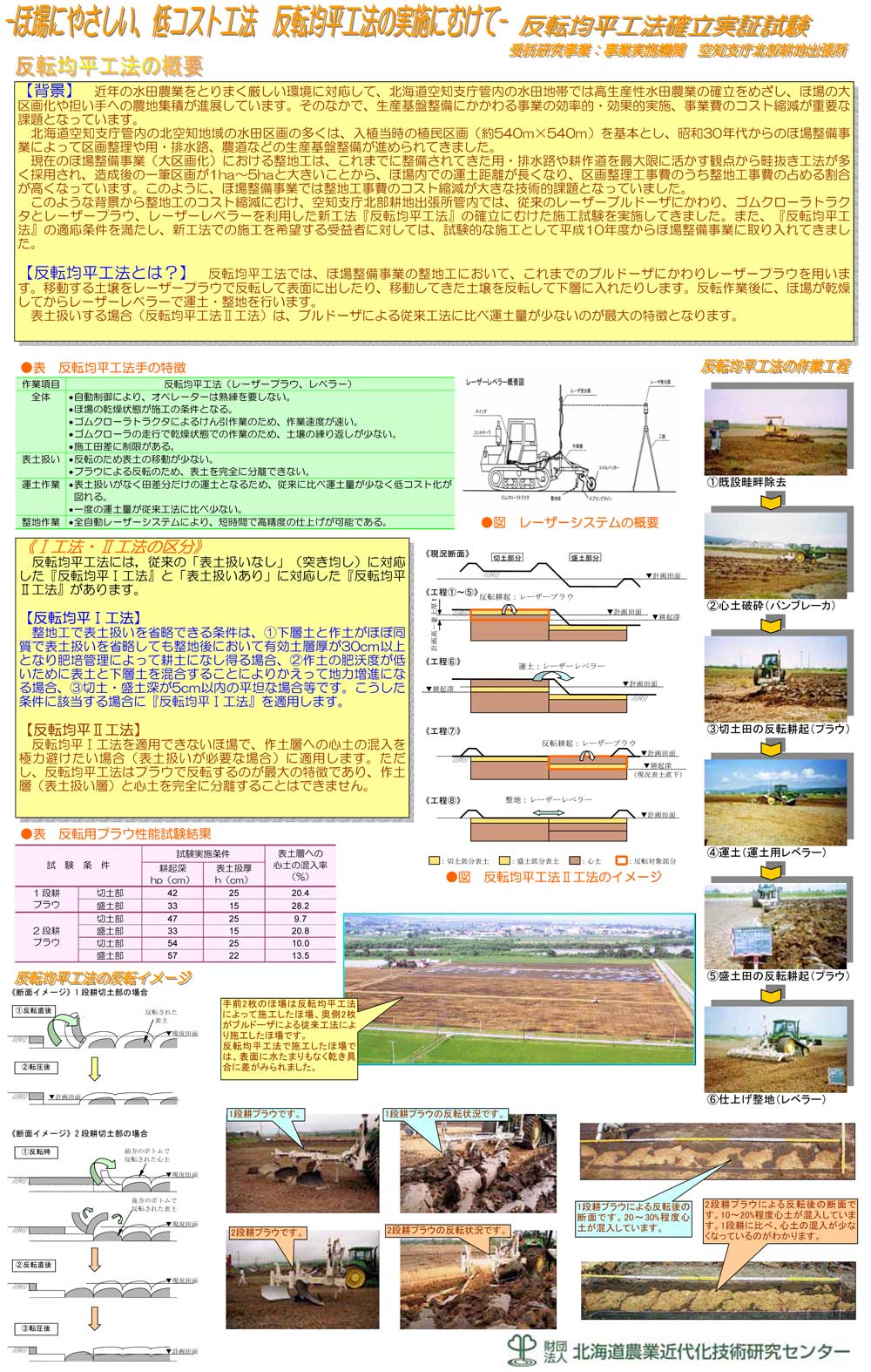 このような背景から整地工のコスト縮減にむけ、空知支庁北部耕地出張所管内では、従来のレーザーブルドーザにかわり、ゴムクローラトラクタとレーザープラウ、レーザーレベラーを利用した新工法『反転均平工法』の確立にむけた施工試験を実施してきました。また、『反転均平工法』の適応条件を満たし、新工法での施工を希望する受益者に対しては、試験的な施工として平成10年度からほ場整備事業に取り入れてきました。