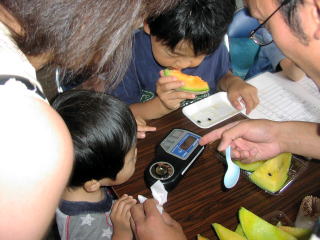 会場では、水・土に関連するパネルを展示し、メロン・スイカ・トマトの試食と糖度測定を体験してもらい、お米の科学実験もあわせて行いました。