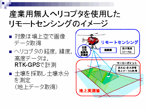 今回の事例は、産業用無人ヘリコプタにサーモトレーサを搭載し、ほ場単位で撮影した画像データから表面の水分状態を推定するもので、同一ほ場内、隣接するほ場間の水分状態を把握するのに有効な手法である。
