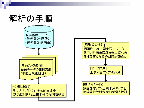 近年、リモートセンシングによる農地の土壌水分推定手法の研究開発が進められている。これまでは、人工衛星や航空測量レーザなどに近赤外画像による土壌水分の推定が行われてきた。一方、熱画像は、人工衛星画像や定点に設置されたサーモトレーサによって取得されたデータをもとに解析が行われている。