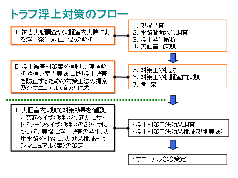 前回(平成16年度)は、実証室内実験及び検証室内実験等から浮上発生メカニズムの解析と対策工の検討及び考察、更には一連のマニュアル(案)の作成までを行い中間報告を行った。