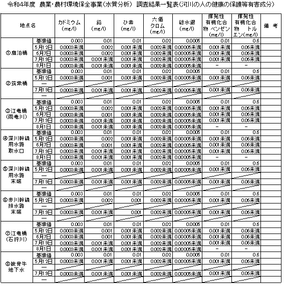 | 2) | 河川の人の健康の保護に関する等水質分析7項目 重金属等有害物質は、4回の調査の結果すべて基準値以内であった。 |